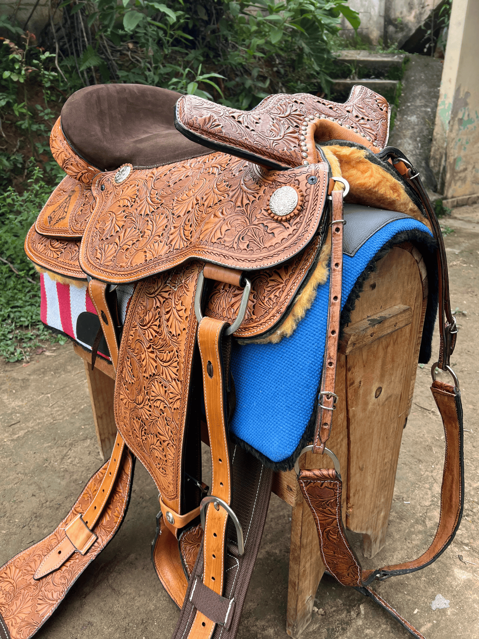 Totalmente entalhado à mão e personalizado, esse arreio pode receber nome, iniciais ou logotipo, tornando cada peça única. Os acabamentos com tranças em couro cru reforçam o estilo tradicional e sofisticado do conjunto.