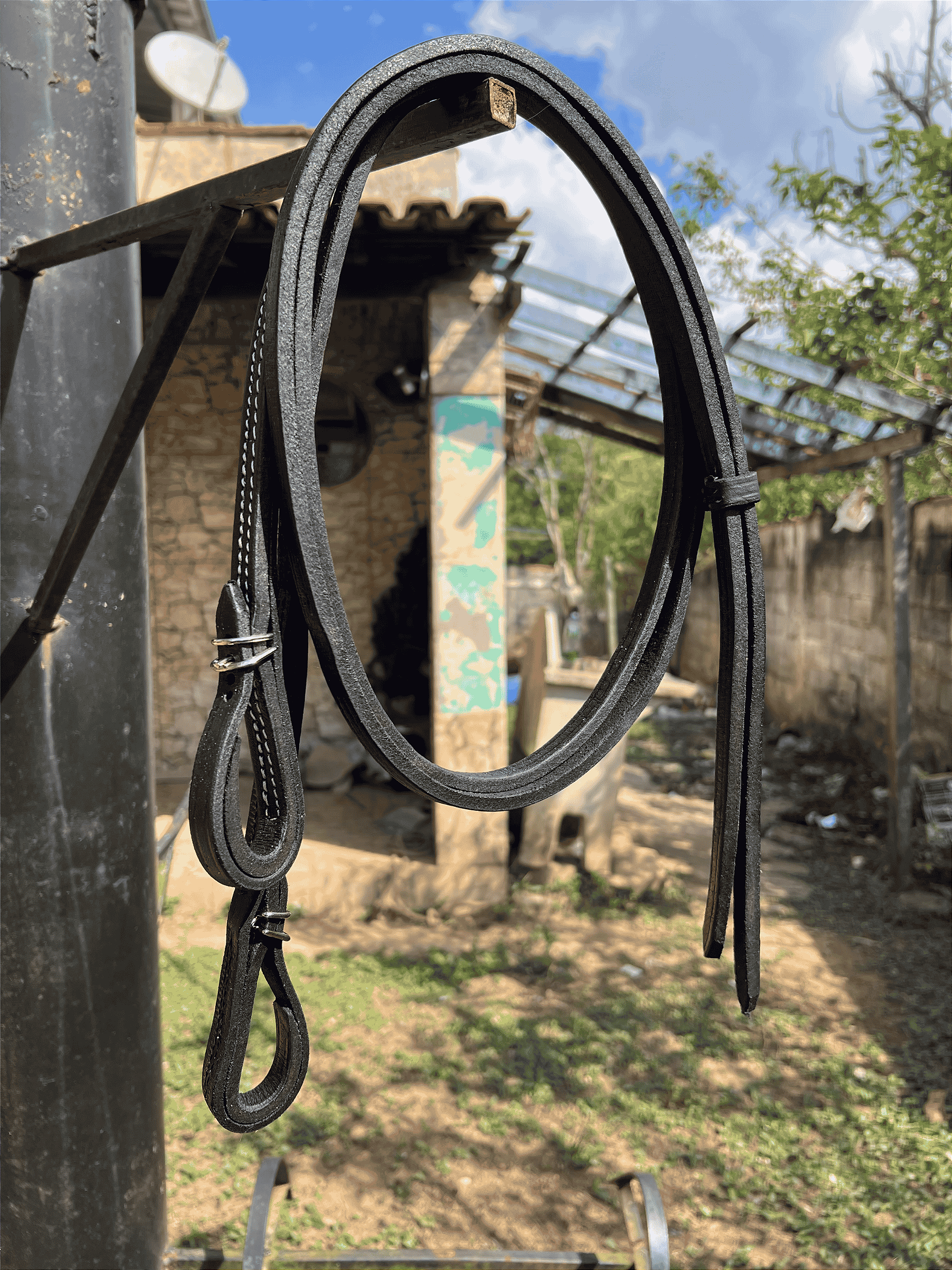 Com acabamento artesanal e costura reforçada, essa rédea combina resistência com um visual sofisticado, tornando-se perfeita para cavaleiros que exigem desempenho e estilo. As argolas e fivelas em aço inox garantem longa durabilidade, resistência à oxidação e um encaixe perfeito com a cabeçada e o freio.