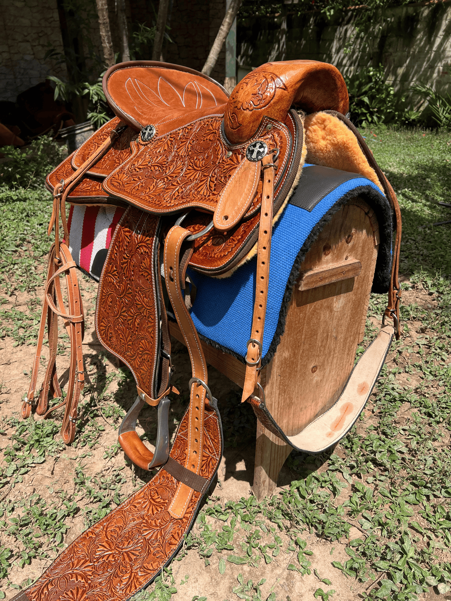 Porque ela foi feita para quem precisa de resistência extrema e controle total nas provas de laço cumprido. Uma sela que une tradição, técnica e acabamento artesanal para entregar segurança e performance profissional.